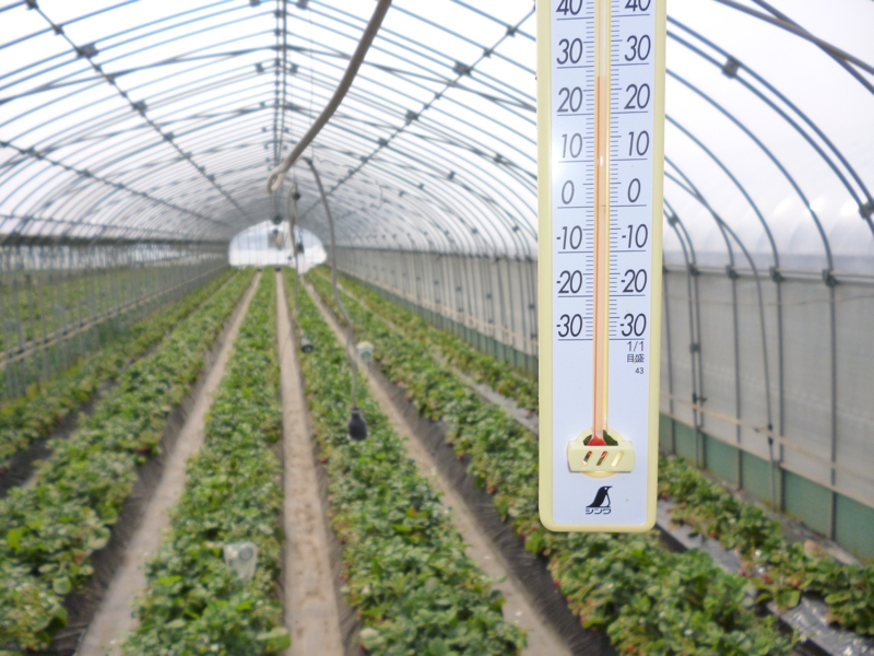せっかくの連休は、雨が降ったかと思うと、今日は気温が上がって、外気温でも25℃くらいになったようで、差が激しいですね。これくらい気温が上がってしまうとハウスの中は夏のよう。苺にもつらい気温です。