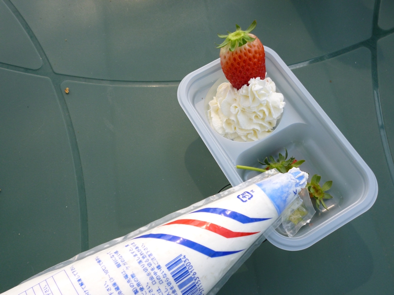 今日ご来園のお客さまでユニークだったのは、業務用ホイップクリーム持参の若いお二人です。おいしいクリームが有るので、それを楽しむために苺狩りに行こうと思いつき、Webで当園を調べて来られたとの事。休憩スペースが有るので、ゆっくり楽しんで行かれました。
