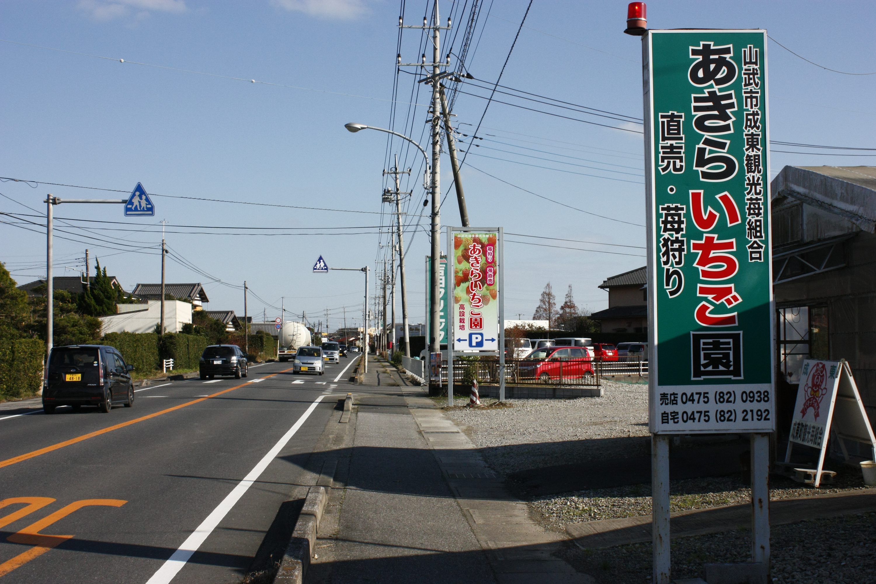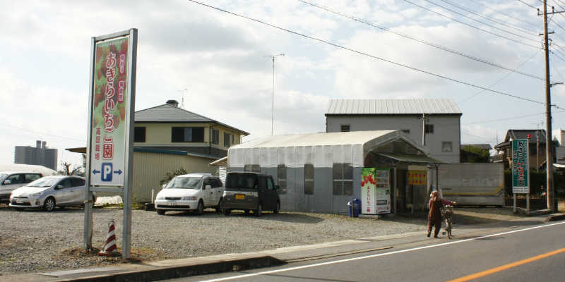 インターを出て、突き当たりを左折し、道なりに進むとJRの踏切が有り、さらに進むと「JA緑の風」、突き当たりは「すぎのや本陣」があるT字交差点です。そこを左折して、国道126号線(ストロベリーロード)を銚子方向へ道なりに進むと、あきらいちご園の直売所が見えて来ます。駐車場は道路を挟んで両側にあります。