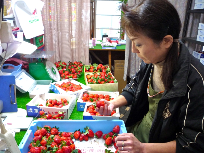 苺も丸々と大きくなって、真っ赤になりました。一口ではとても食べられない大きさです。もちろん香りも甘みも十分。あきひめ、べにほっぺ、ふさのか、とちおとめが楽しめます。さちのかが、もう少しすれば加わって来ますよ。収穫したイチゴは、このように販売所でひとつひとつ選別して並べられますが、数があるのでこれも大変な作業です。