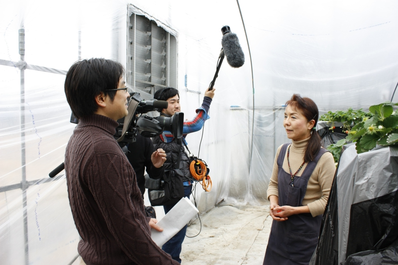 全国ネットのニュース番組で、山武市成東の苺狩りとして、当園で取材が有りました。今年はイチゴのスイーツが流行だとの事で、栽培農家の様子と今年のイチゴの出来具合のインタビューでした。苺狩りしているお客さまにもコメントしていただき、ありがとうございました。テレビをきっかけに、成東の苺狩りに行ってみようと思う方が、一人でも増えたらうれしいですね。
